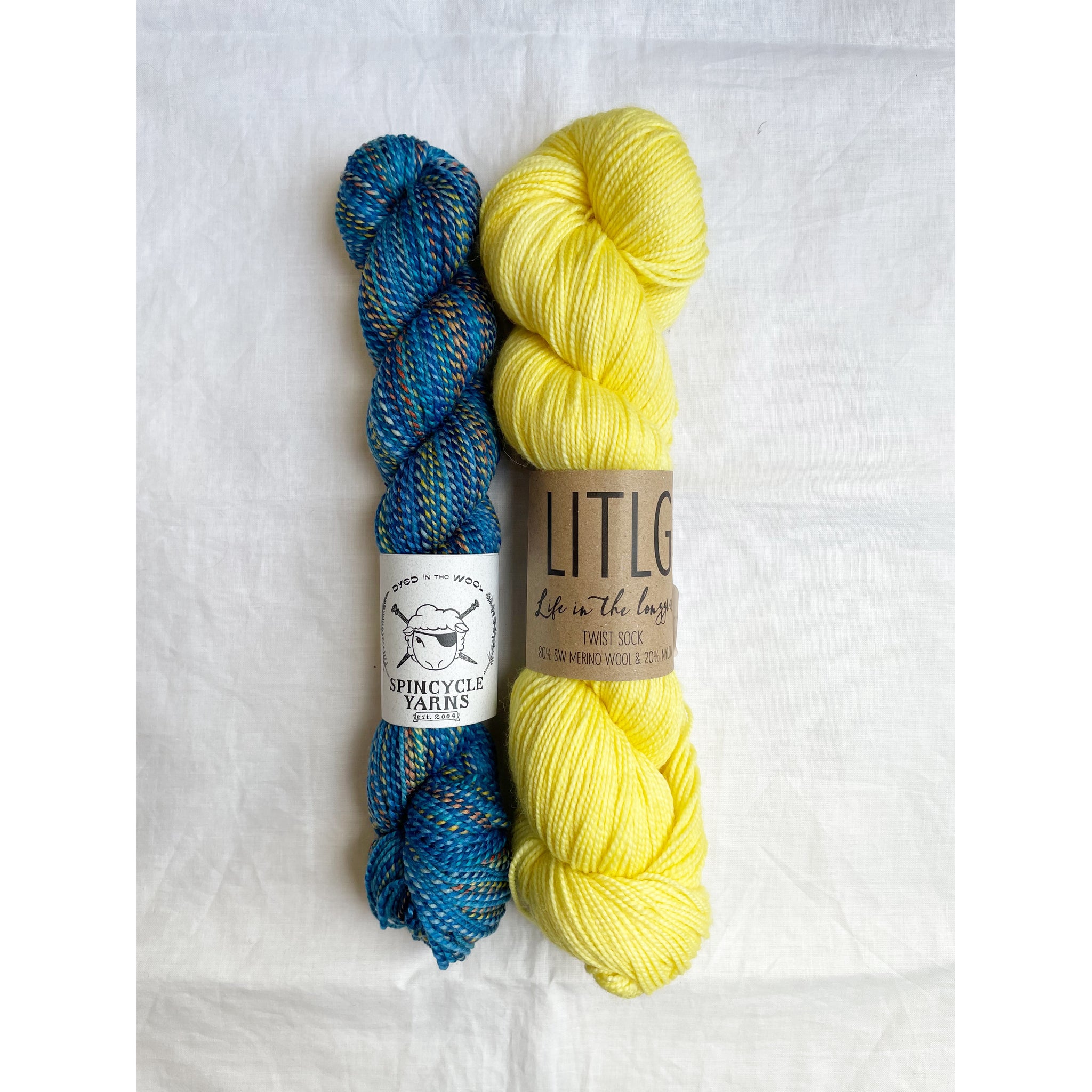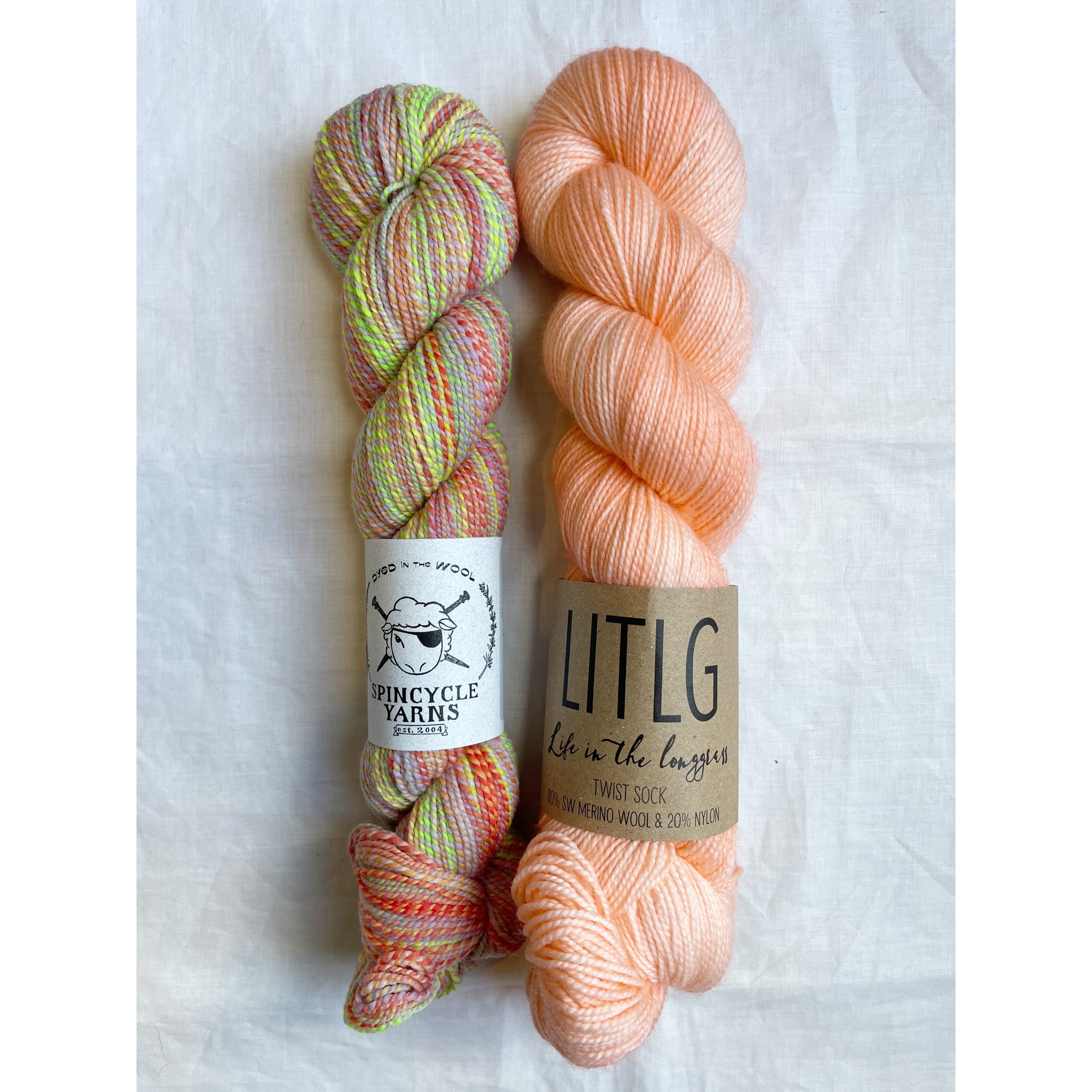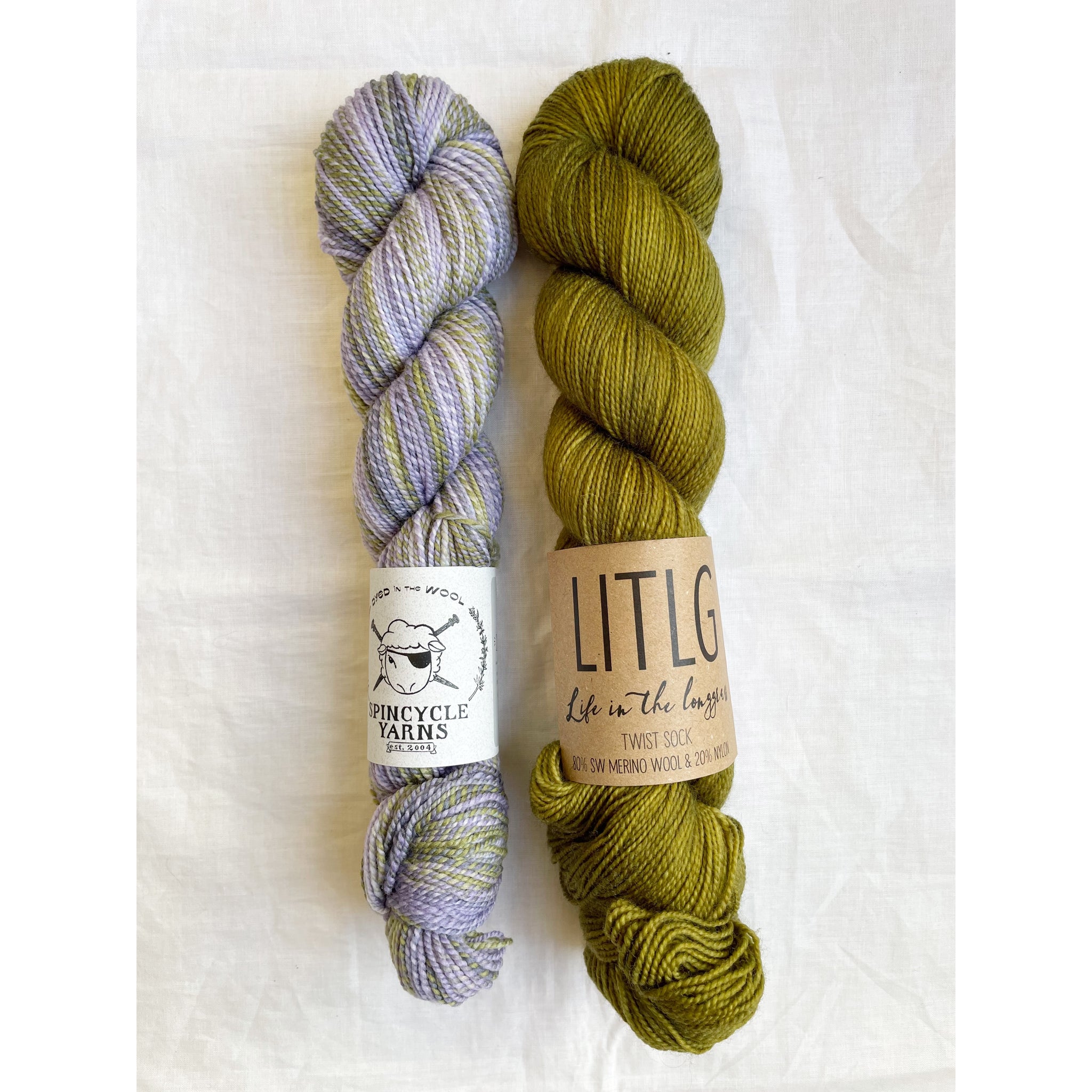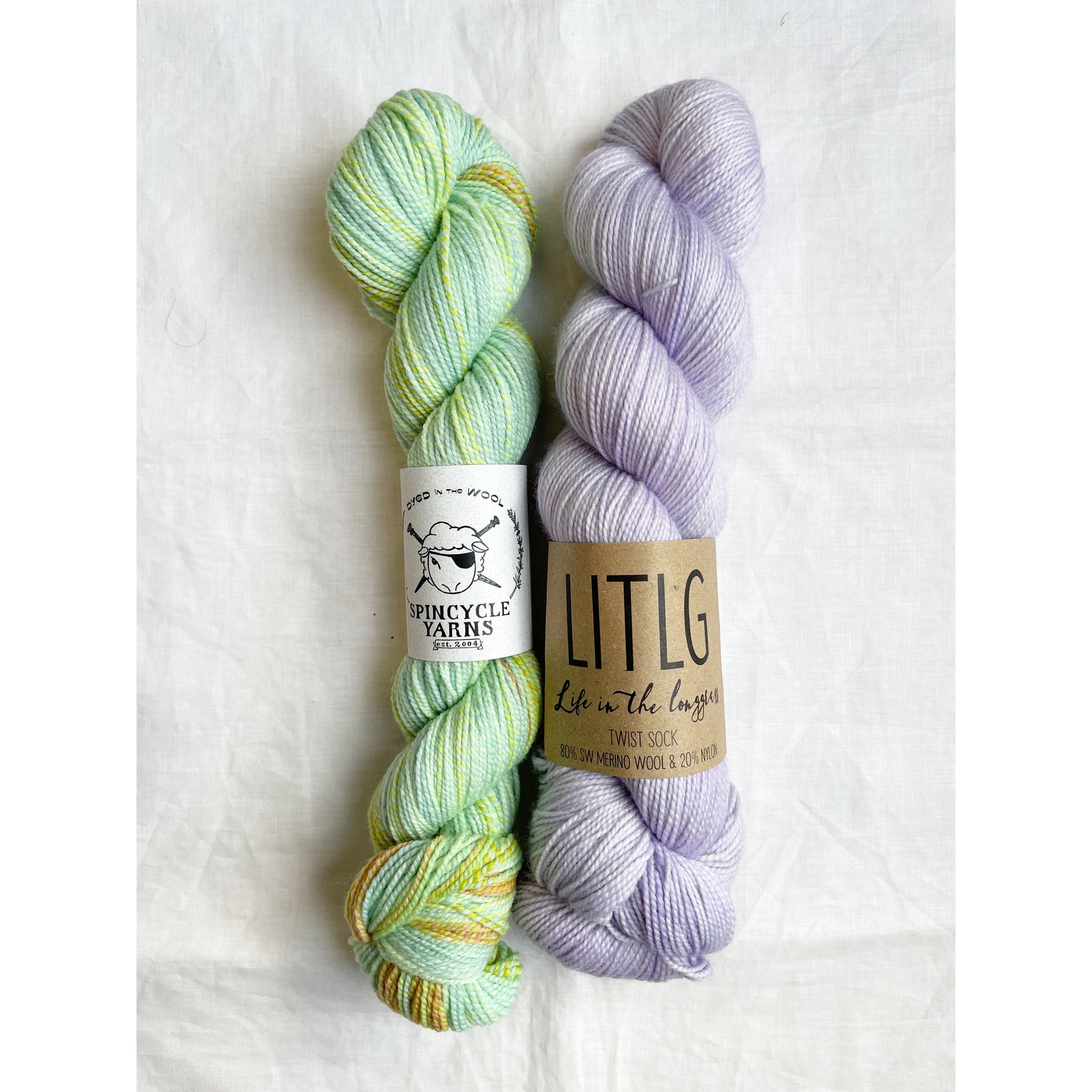 Our Ooey Gooey Sock Kit includes one skein of Spin Cycle Dyed in the Wool, with a coordinating skein of LITLG Twist Sock or Moondrake Merino High Twist.